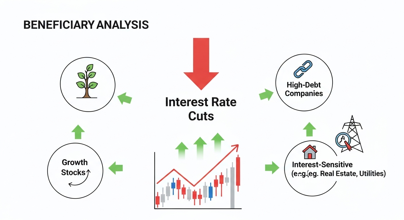 고금리 수혜 업종(예: 은행, 보험, 금융투자) 중심에서 금리 인하 수혜 업종(성장주, 경기민감주, 설비 투자주) 중심으로 주도섹터 전환 가능성이 제기됩니다. 이는 투자자 포트폴리오 재편 기회로 작용할 수 있습니다.